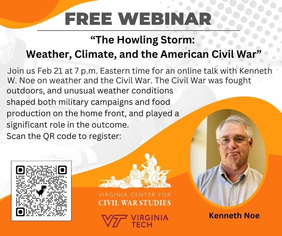 The Virginia Center for the Civil War Studies at Virginia Tech presents the online virtual public lecture titled "The Howling Storm: Weather, Climate, and the American Civil War" online on Zoom on Wednesday, February 21, 2024.