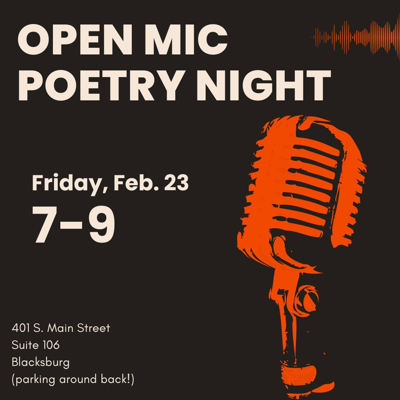 Blacksburg Books presents February Poetry Open Mic Night on Friday, February 23, 2024.