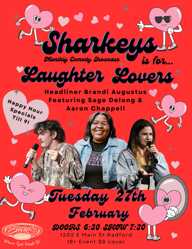 Sharkeys Radford Monthly Comedy Showcase is feeling the love this month! We have the cutest bunch of jokesters coming your way headlined by Brandi Augustus also featuring local sweethearts Sage Delong and Aaron Chappell.