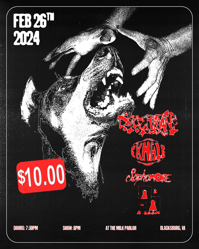 The Milk Parlor presents a Four Band Concert with A Doberman's Shadow, Exhale, Sophomore and 2ToAROOM on Monday, February 26, 2024.