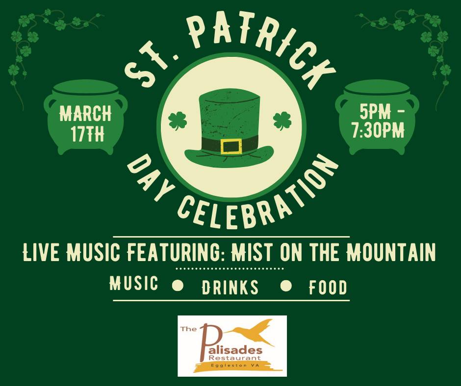 The Palisades Restaurant presents Mist on the Mountain in concert on St. Patrick's Day on Sunday, March 17, 2024.