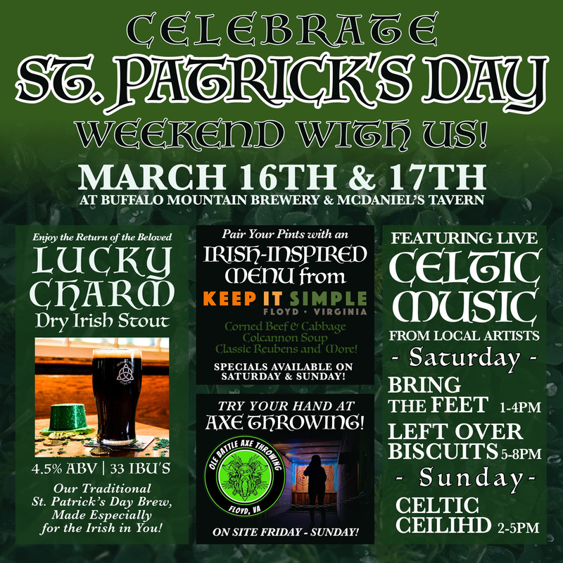 Buffalo Mountain Brewery presents their 2024 Saint Patrick's Day Celebration on Saturday, March 16, 2024.