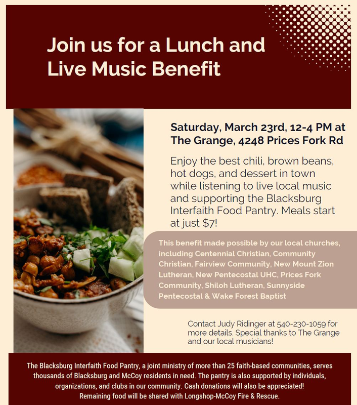 A Lunch and Live Music Benefit for the Blacksburg Interfaith Food Pantry will be held on Saturday, March 23, 2024 at the Prices Fork Grange.