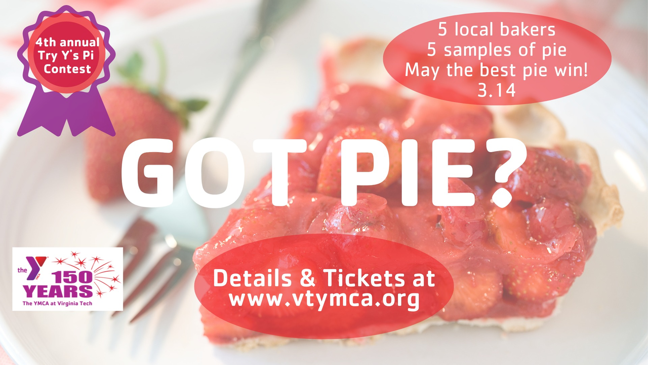 The YMCA at Virginia Tech presents the 4th Annual Try Y's Pi with ticket sales through Tuesday, March 12, 2024 and pie sampler pick-up on Thursday, March 14, 2024 between 4:00 PM to 6:00 PM.