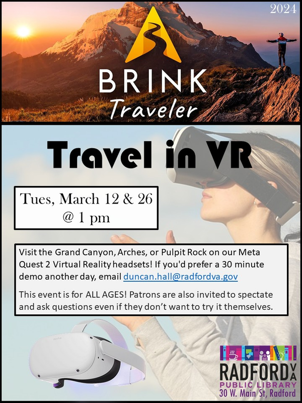 The Radford Public Library presents Travel in Virtual Reality on Tuesday, March 26, 2024.