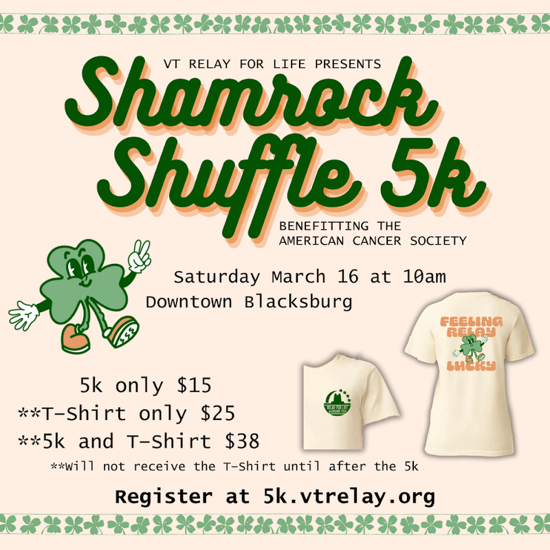 Virginia Tech Relay For Life presents the Shamrock Shuffle 5k on Saturday, March 16, 2024 starting and ending at 200 Clay Street in downtown Blacksburg, VA.