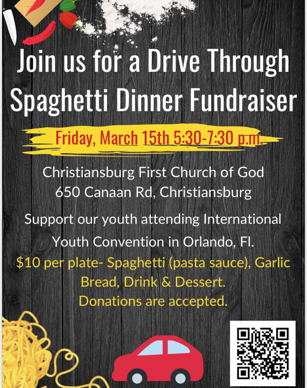 The First Church of God Christiansburg presents a Drive Through Spaghetti Dinner Fundraiser on Friday, March 15, 2024.
