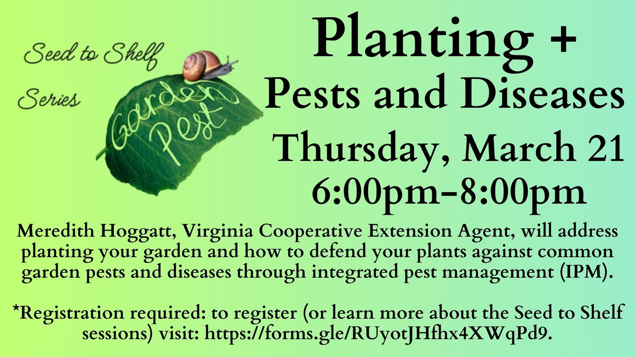 Meredith Hoggatt, Virginia Cooperative Extension Agent, will address planting your garden and how to defend your plants against common garden pests and diseases through integrated pest management (IPM).