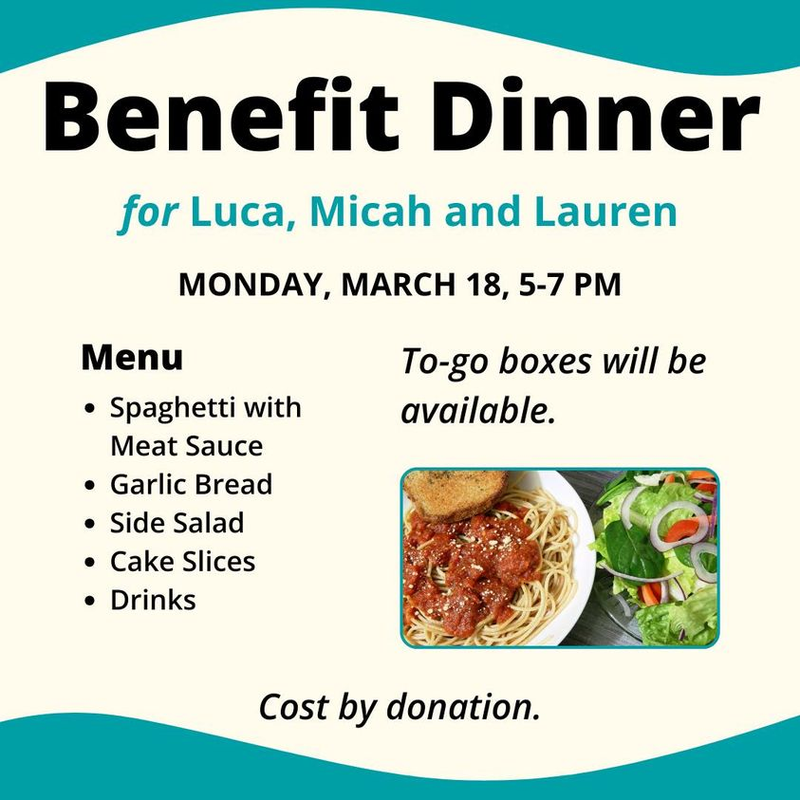 We're hosting a benefit dinner for three teenagers in our community, Luca, Micah and Lauren. Please plan to come out and support these teenagers!