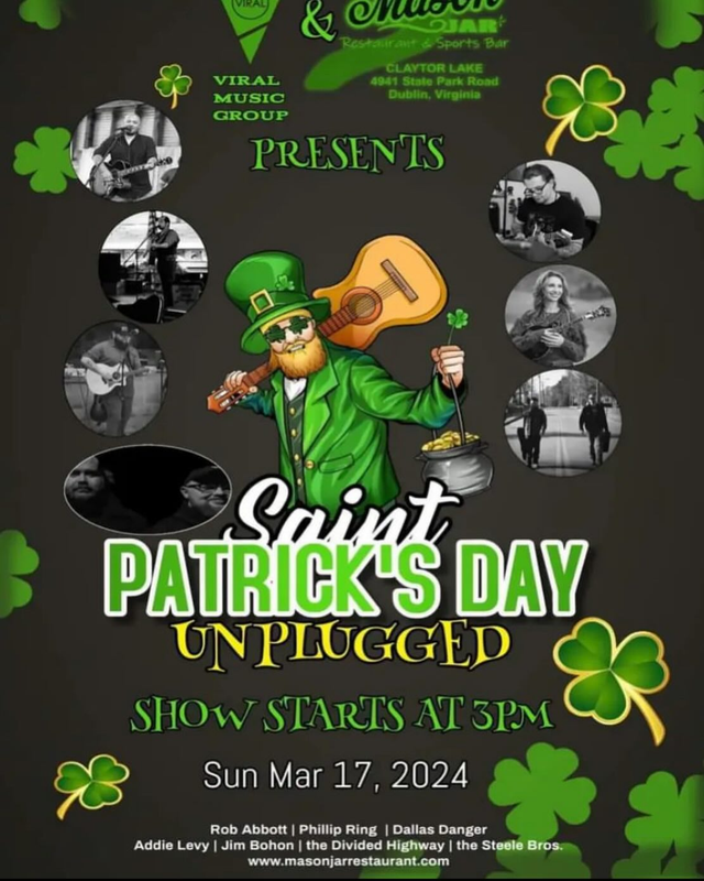 The Mason Jar at Claytor Lake presents Saint Patrick's Day Unplugged with Multiple Bands on Sunday, March 17, 2024.
