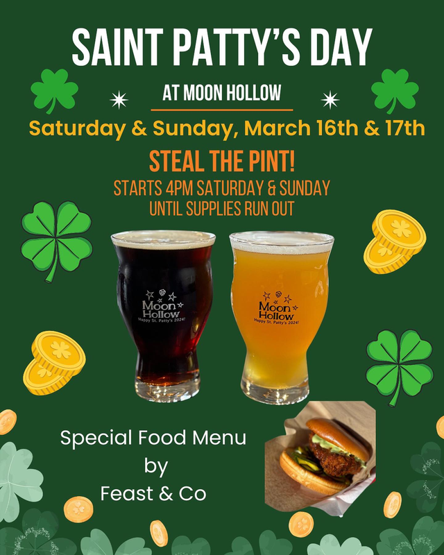 Moon Hollow Brewing presents a Saint Patrick's Day Steal The Pint on Saturday, March 16, 2024 and Sunday, March 17, 2024 starting at 4:00 PM each day.