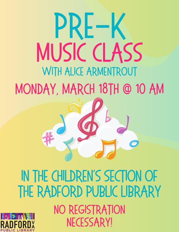 The Radford Public Library presents a Pre-K Music Class on Monday, March 18, 2024.