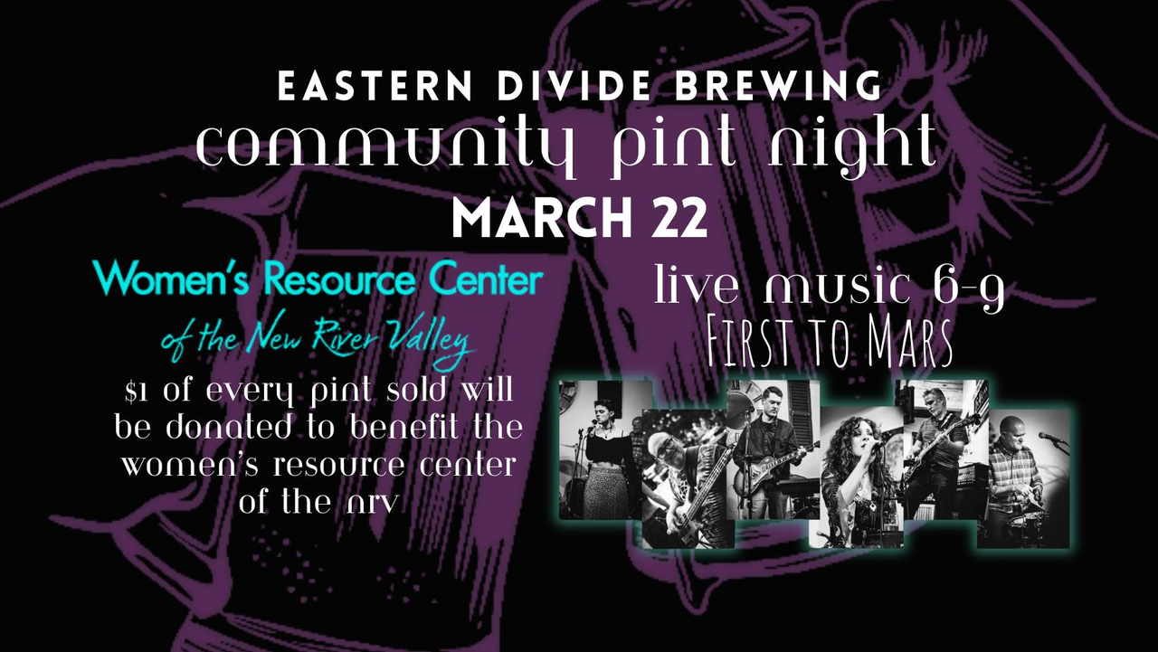 Eastern Divide Brewing presents their March Community Pint Night for Women's Resource of the New River Valley with Music from First to Mars on Friday, March 22, 2024.