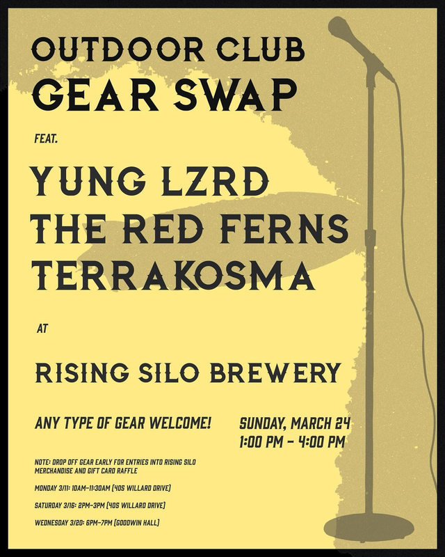 The Outdoor Club at Virginia Tech presents an Outdoor Gear Swap with Live Music from Yung Lzrd, The Red Ferns and Terrakosma on Sunday, March 24, 2024 at Rising Silo Farm Brewery.