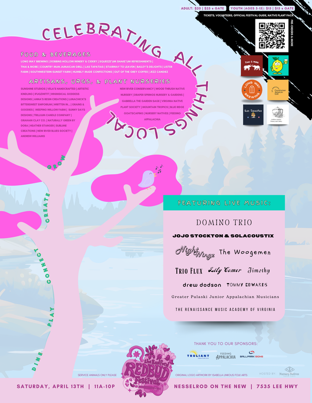 Nursery Natives presents the 2nd Annual Radford Redbud Festival 2024 on Saturday, April 13, 2024 at Nesselrod on the New.