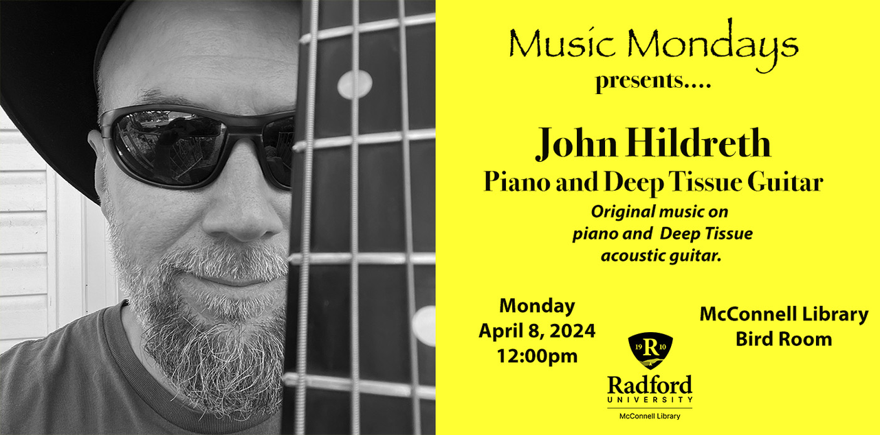 The McConnell Library, on the campus of Radford University, continues their Spring 2024 Semester Music Mondays series with John Hildreth on Monday, April 8, 2024 inside the Bird Room.