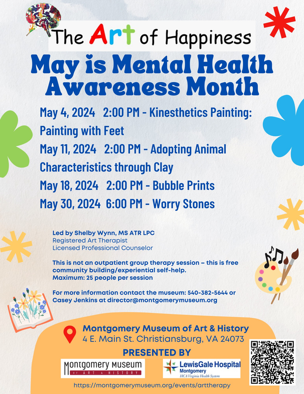 The Montgomery Museum of Art & History is bringing back "The Art of Happiness" during May, which is Mental Health Awareness Month. We are offering self-help coping tactics and strategies by using art exhibits, materials, and spaces as helpful tools to address emotional well-being. This interactive series will focus on aspects of positive psychology and the role that art can play in general happiness.