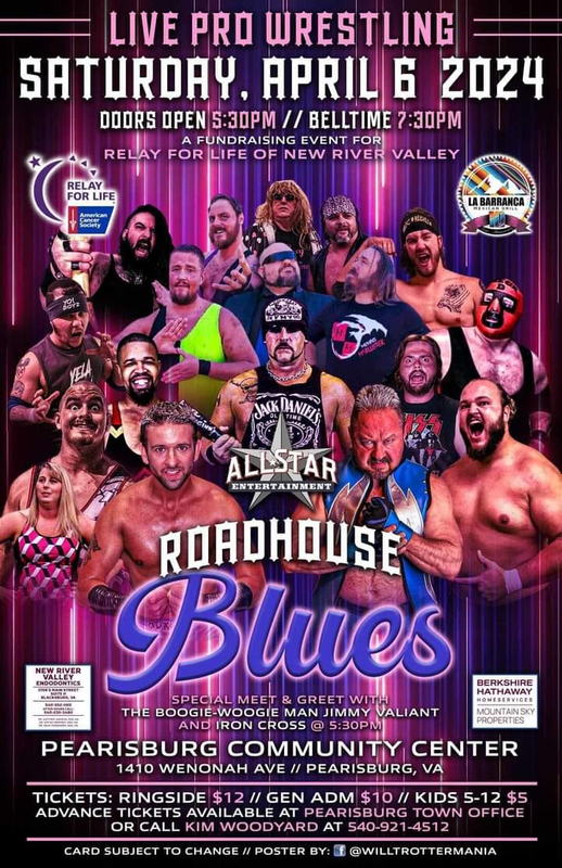 Relay For Life of the New River Valley presents Live Professional Wrestling with All Star Entertainment on Saturday, April 6, 2024 at the Pearisburg Community Center.