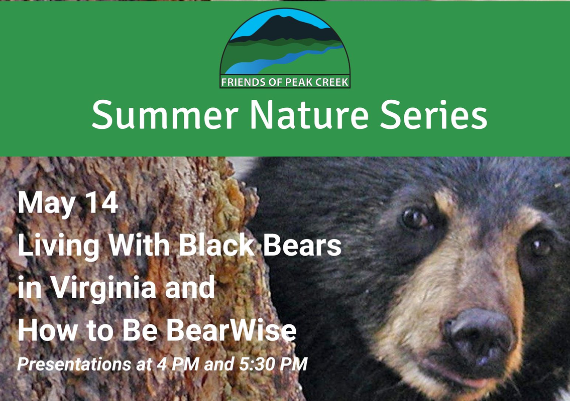 Join the New River Valley chapter of Virginia Master Naturalists in partnership with the Virginia Department of Wildlife Resources for the first session of Friends of Peak Creek Summer Nature Series, a new education / outreach program, with the first session titled "Living with Black Bears in Virginia and how to be BearWise".