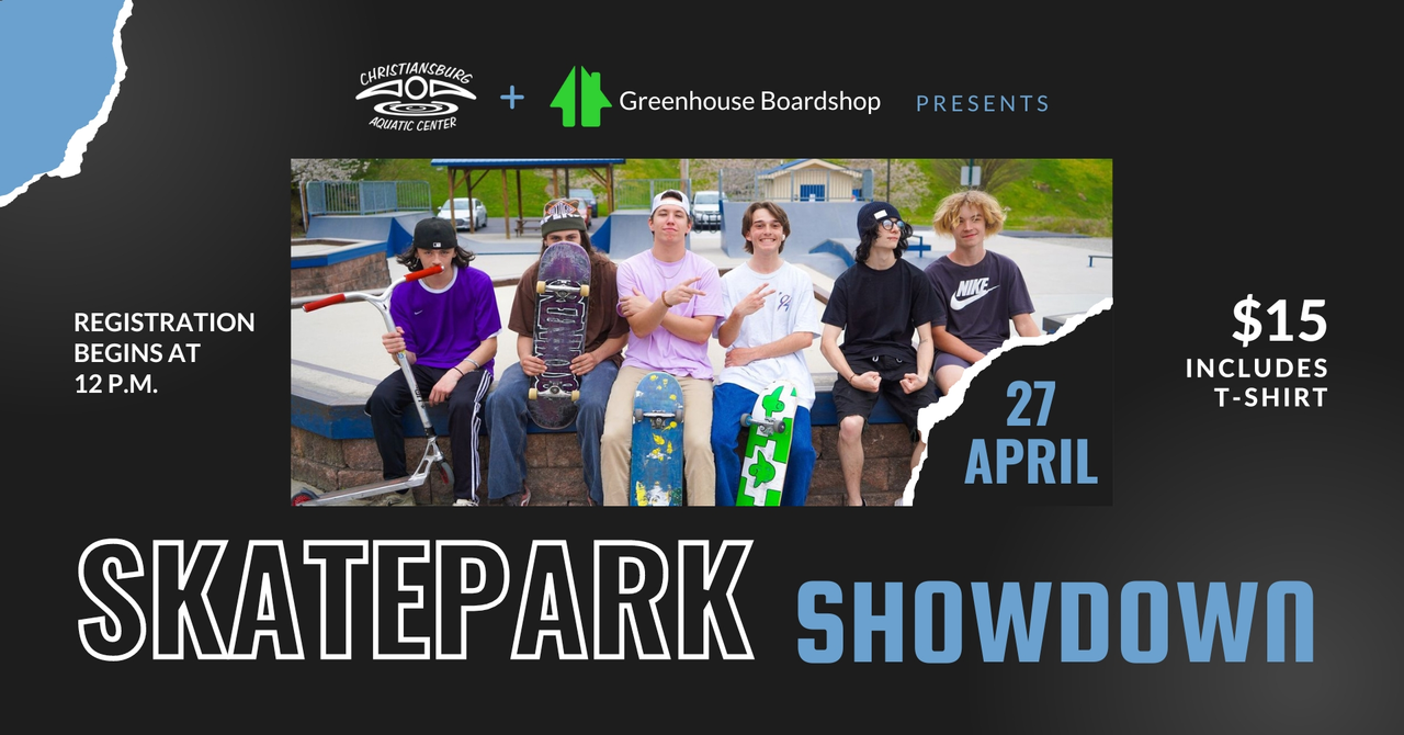 The Christiansburg Aquatic Center and Greenhouse Boardshop present the Skateboard Showdown 2024 on Saturday, April 27 at the Christiansburg Skate Park.