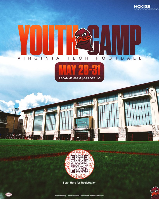 Virginia Tech Football presents the 2024 Virginia Tech Football Youth Camp starting on Tuesday, May 28, 2024 and continuing through Friday, May, 31 2024 from 9:00 AM to 12:00 PM daily held at the indoor and outdoor football practice facilities.