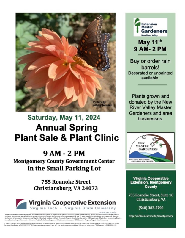 The New River Valley Master Gardener Association presents their Annual Plant Sale on Saturday, May 11, 2024 at the Montgomery County Government Center in Christiansburg, VA in the small parking lot.