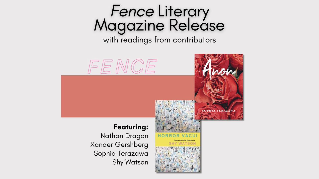 Join us for the release of the latest issue of Fence, with readings from four featured poets - Nathan Dragon, Xander Gershberg, Sophia Terazawa, and Shy Watson.