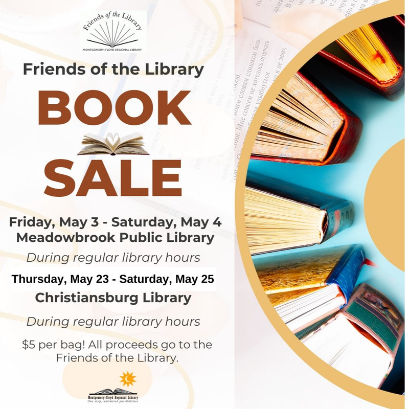 The Christiansburg Library presents the Friends of the Library Three Day Book Sale starting on Thursday, May 23, 2024 and continuing through Saturday, May 25, 2024.