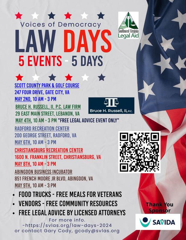 The Southwest Virginia Legal Aid Society continues their 2024 Law Days on Wednesday, May 8, 2024 at the Christiansburg Recreation Center.
