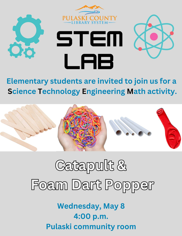 The Pulaski County Library continues their STEM Lab series with "Catapult & Foam Dart Popper" on Wednesday, May 8, 2024 in the Community Room.