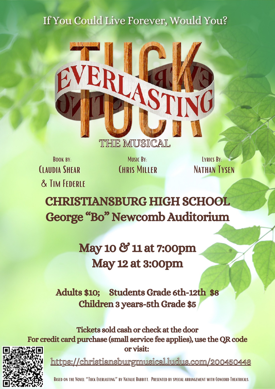 Join the music students at Christiansburg High school for our annual spring musical! This enchanting production tells the story of 11 year old Winnie Foster as she yearns for a life of adventure beyond her white picket fence. When she becomes unexpectedly entwined with the Tuck Family she finds more excitement than she could have imagined!
