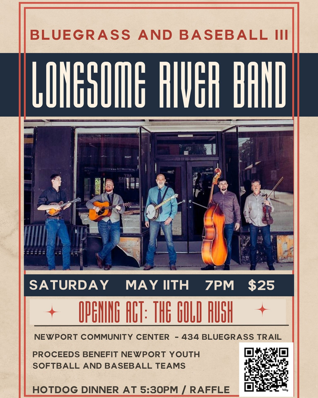 The 3nd Annual Bluegrass and Baseball Benefit with music from the Lonesome River Band and opening band Gold Rush will be held on Saturday, May 11, 2024 at the Newport Community Center.