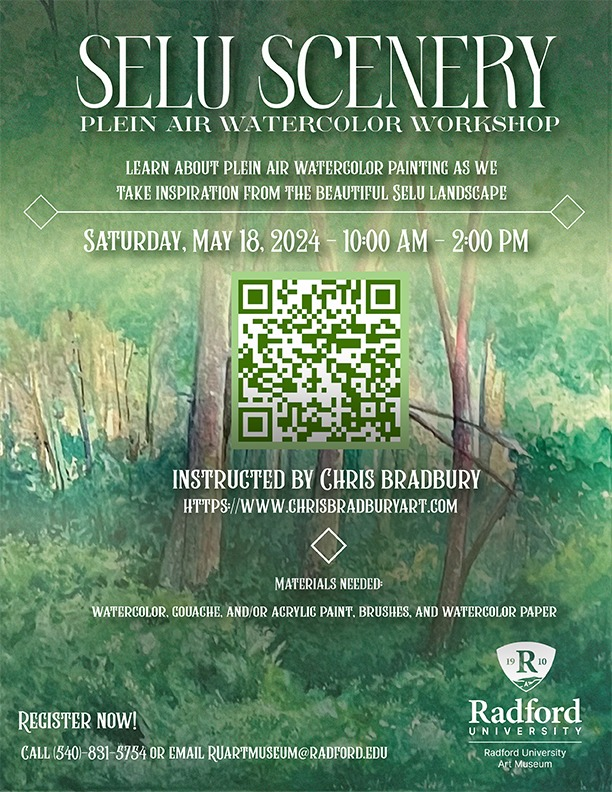 The Radford University College of Visual & Performing Arts kicks off their 2024 Plein Air Watercolor Workshop Series with Selu Scenery" on Saturday, May 18, 2024 at Selu Conservancy in Radford, VA.