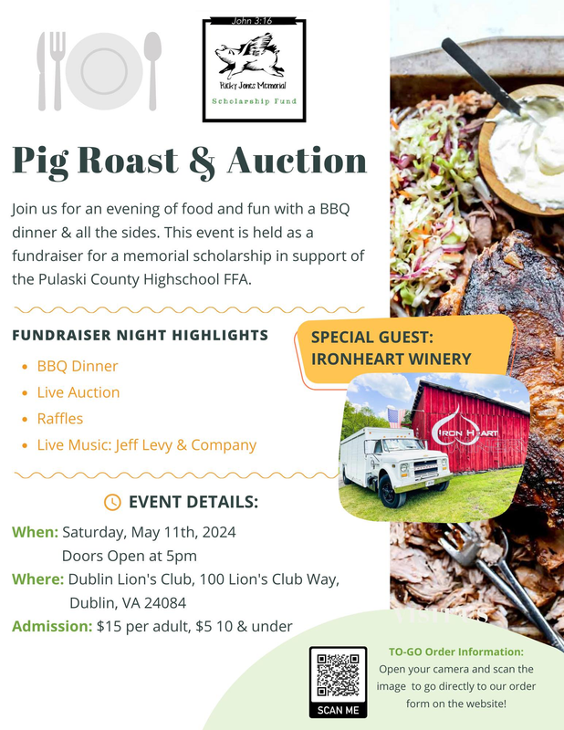 The Ricky Jones Memorial Scholarship Fund presents the 2024 Pig Roast & Auction on Saturday, May 11, 2024 at the Dublin Lions Club Building.
