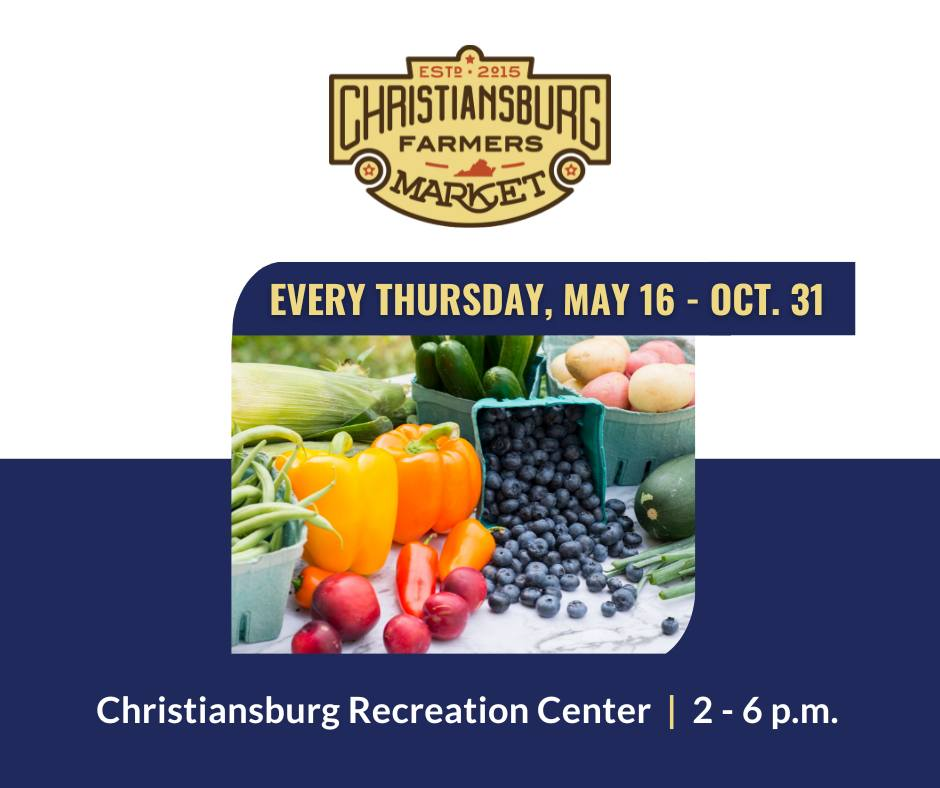 The Christiansburg Farmers Market is open every Thursday from 2:00-6:00 PM at the Christiansburg Rec Center from May 16th through October 31st.