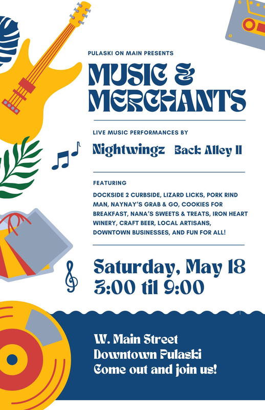 UPDATE: Pulaski on Main regrets to announce that the Music and Merchants Festival, originally scheduled for this Saturday, will be postponed due to inclement weather forecasts. The event will now take place on Saturday, June 22nd.