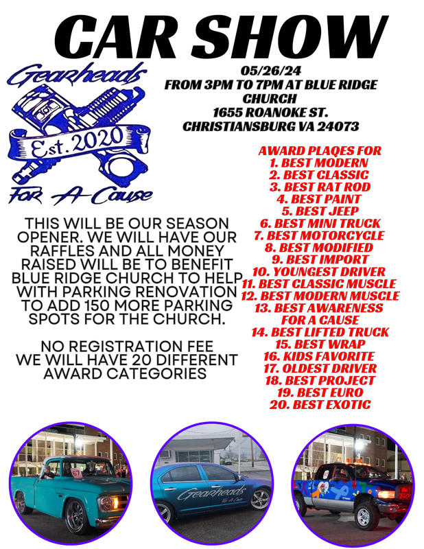 Gearheads For A Cause presents their 4th Season Car Show Kickoff titled "Advancing the Vision at Blue Ridge Church" on Sunday, May 26, 2024 outside at the Blue Ridge Church parking lot.