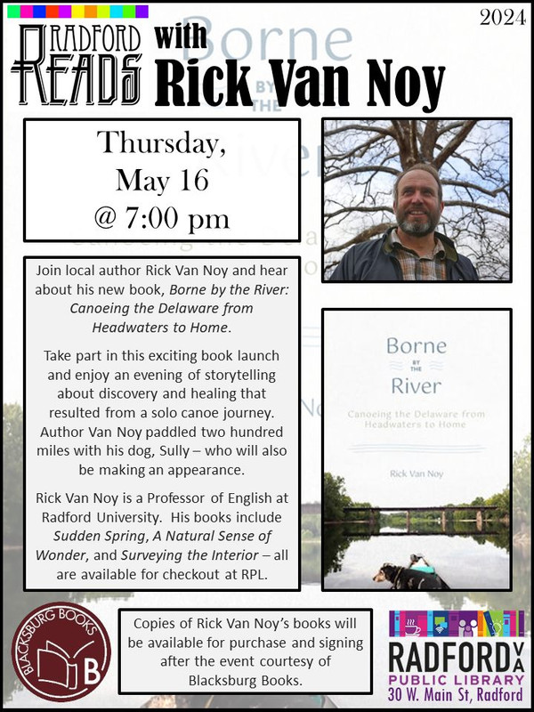 Rick Van Noy is a Professor of English at Radford University. His books include "Sudden Spring", "A Natural Sense of Wonder", and "Surveying the Interior", all are available for checkout at Radford Public Library. Copies of Rick Van Noy’s books will be available for purchase and signing after the event courtesy of Blacksburg Books.
