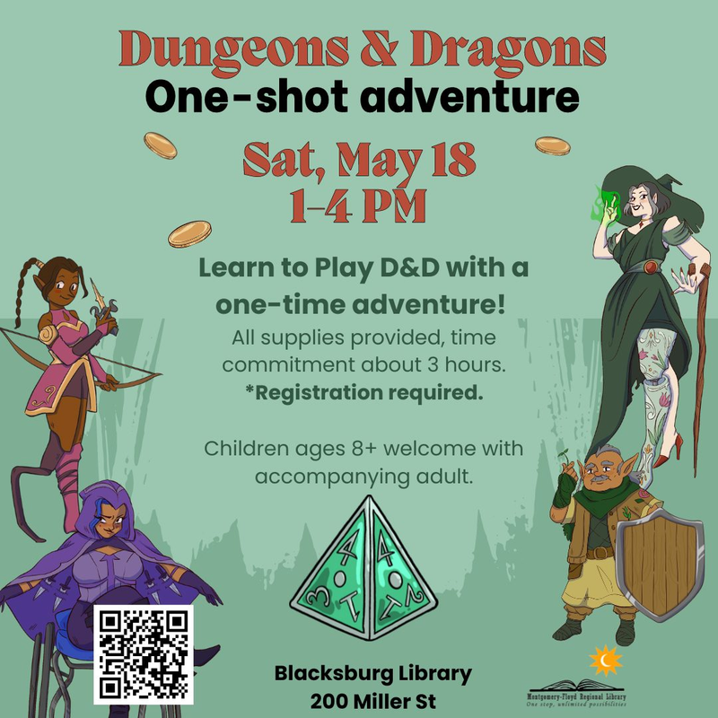 The Blacksburg Library presents a Dungeons & Dragons One-Shot Adventure on Saturday, May 18, 2024.