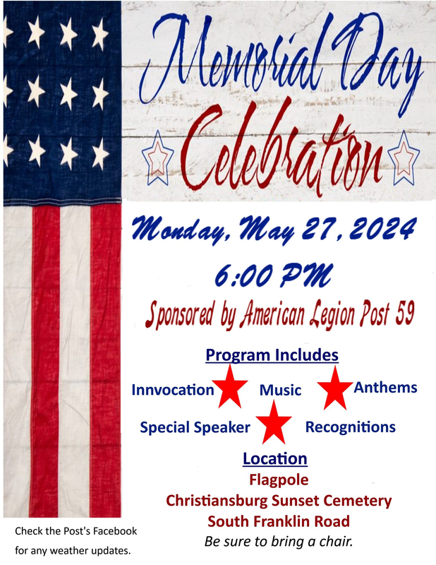 American Legion Post 59 presents a Memorial Day Celebration on Monday, May 27, 2024 at the flagpole in Sunset Cemetery in Christiansburg, VA.