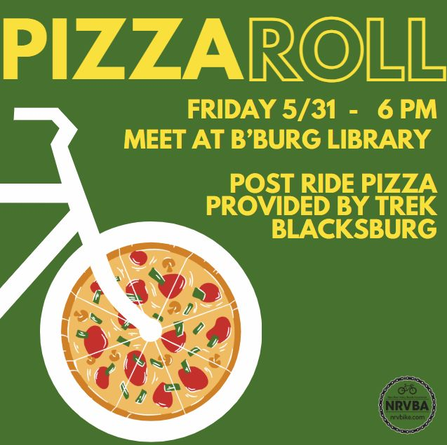 The New River Valley Bicycle Association (NRVBA) presents a Pizza Roll on Friday, May 31, 2024 starting at the Blacksburg Library.