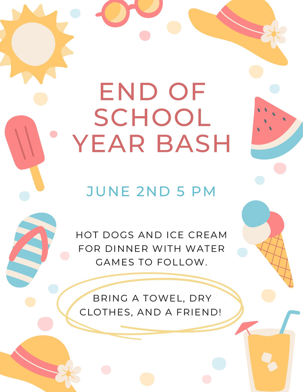 Join us for our End of School Year Bash where we will be having hot dogs and ice cream for dinner with water games to follow.