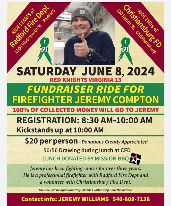 The Radford Fire Department and Christiansburg Fire Department presents a Fundraiser Ride For Firefighter Jeremy Compton and His Family starting at the Radford Fire Department and ending on the Christiansburg Fire Department on Saturday, June 8, 2024.