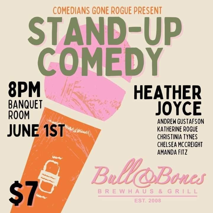 Comedians Gone Rogue presents a Stand Up Comedy Show with Headliner Heather Joyce on Saturday, June 1, 2024 in the Banquet Room at Bull & Bones Brewhaus & Grill in Blacksburg, VA.