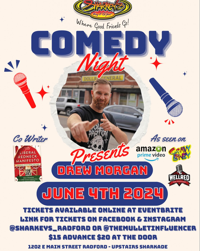 Sharkey's Radford, VA's presents Sharkey's Comedy Night with Headliner Drew Morgan on Tuesday, June 4, 2024 upstairs in the Sharkade.