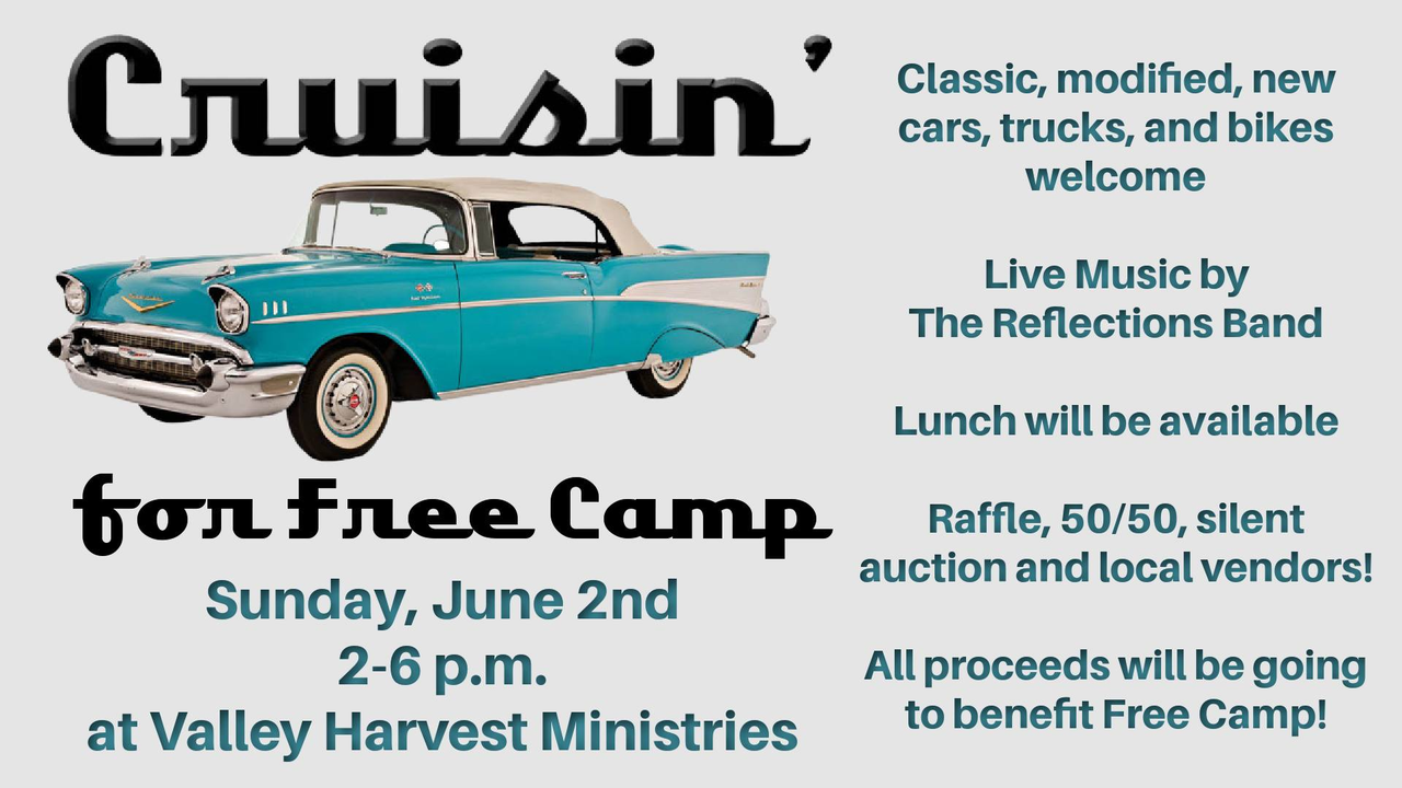 Valley Harvest Ministries presents Cruisin' for Free Camp on Sunday, June 2, 2024.