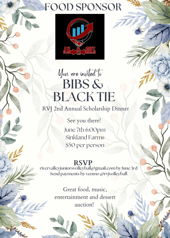 The River Valley Juniors Volleyball Club (RVJ) presents their 2nd Annual Scholarship Dinner titled "Bibs & Black Tie" at Sinkland Farms on Friday, June 7, 2024.