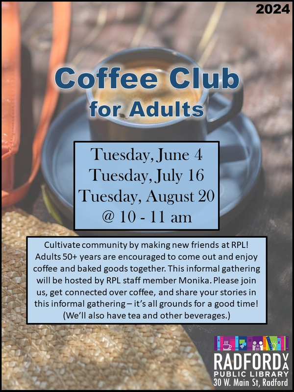 Radford Public Library presents the Coffee Club for Adults 50 Years & Older on Tuesday, June 4, 2024.