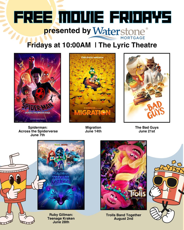 Waterstone Mortgage presents the Free Movie Fridays Kickoff with "Spiderman: Across the Spiderverse" on Friday, June 7, 2024 at The Lyric Theatre.