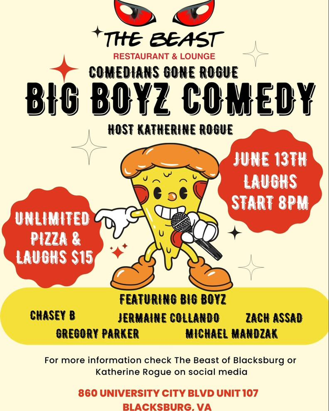 The Beast of Blacksburg Pizzeria & Bar and Comedians Gone Rogue presents a Comedy Show featuring Big Boyz Comedy and more local comedians with Unlimited Pizza on Thursday, June 13, 2024.